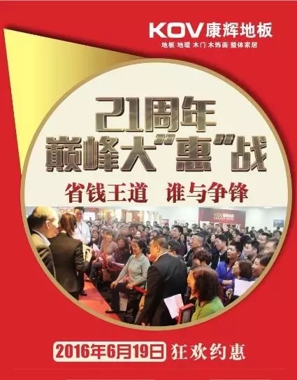 6月19號,為慶?递x木業(yè)成立21周年,康輝地板將在南潯總部發(fā)起619巔峰大惠戰(zhàn)活動,“省錢王道,誰與爭鋒”,專注地板生產(chǎn)二十一年,屆時康輝將推出四重大驚喜,讓你省錢省心省力收獲快樂和滿足。