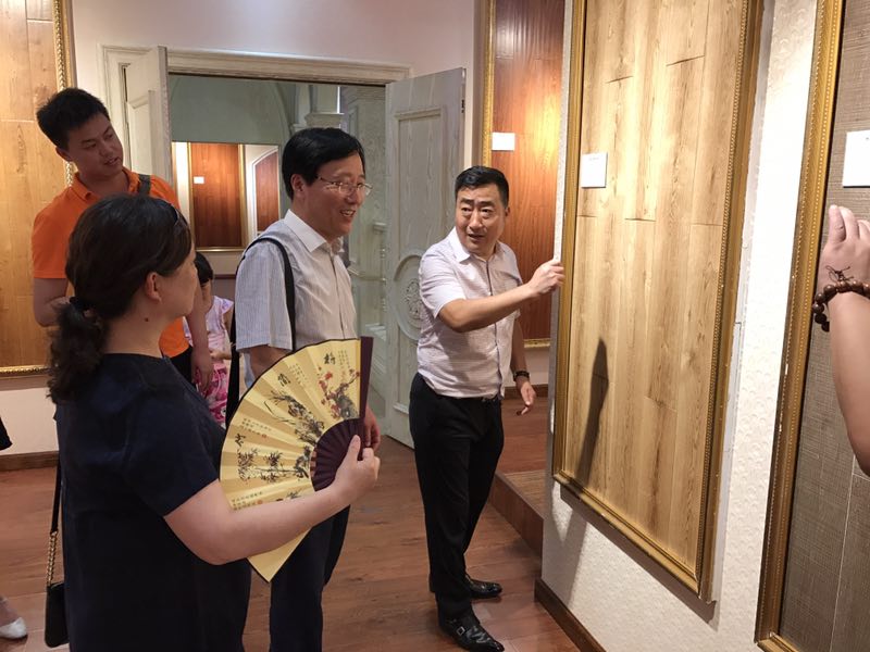康輝地板沈總為劉浩主任及夫人介紹康輝暖芯地板