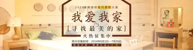 康輝地板我愛我家攝影大賽正在火熱征集報(bào)名中,如果您也有一個(gè)溫馨美麗的家,那么趕緊來(lái)向大家展示下吧,康輝地板為您準(zhǔn)備了萬(wàn)元現(xiàn)金大獎(jiǎng)和豐富精美的禮品等著你哦!
